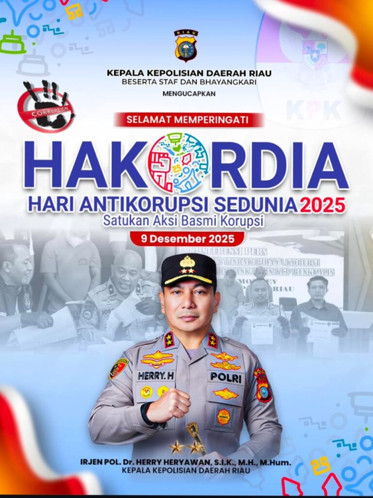 Pekanbaru, Riau – OPSINEWS.COM-Sikap dan ketegasan, kita lawan korupsi jangan kita biarkan di Bumi Lancang Kuning. Kapolda Riau, Irjen Pol Dr. Hery Heryawan, S.I.K., M.H., M.Hum, diucapakan langsung dalam Hari Anti korupsi Sedunia (Hakordia) 2025, yang diikuti oleh Ketua Bhayangkari Polda Riau, para Pejabat Utama (PJU) Polda Riau, serta seluruh Kapolresta, Kapolres, dan Kapolsek se-Provinsi Riau. Peringatan yang dilaksanakan pada tanggal 9 Desember 2025 ini mengusung tema “Satukan