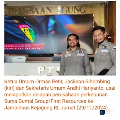 Pekanbaru, Riau. OPSINEWS.COM-Jackson Sihombing (JS) Ketua Umum Organisasi Masyarakat Pemuda Tri Karya (Ormas PETIR) yang melaporkan dugaan kebocoran pajak serta penguasaan lahan milik negara tanpa hak guna usaha (HGU) serta penguasaan lahan di atas kawasan hutan yang diduga dimiliki oleh First Resources/Surya Dumai Group (SDG) ke Kejagung.JS malah ditangkap dugaan pemerasan yang ditangkap Tim RAGA Polda Riau, Senin (13/10/2025) malam di Hotel Furaya Pekanbaru. Polda Riau Diminta