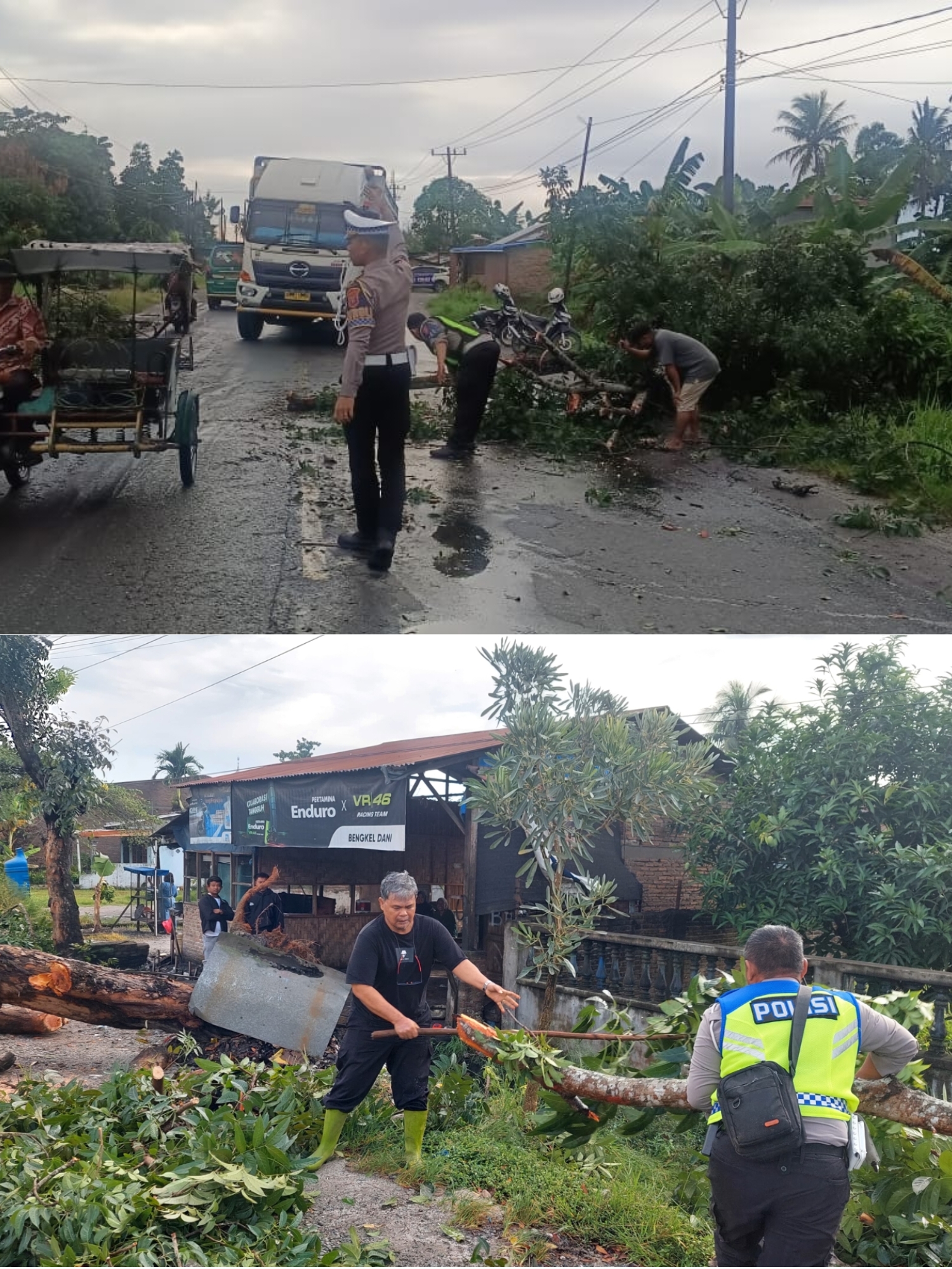 “Personel langsung melakukan tindakan cepat dengan memotong dan membersihkan batang pohon menggunakan parang, kampak, serta chainsaw pinjaman. Kami juga dibantu oleh relawan dan warga sekitar,” ujar IPDA Simanungkalit.