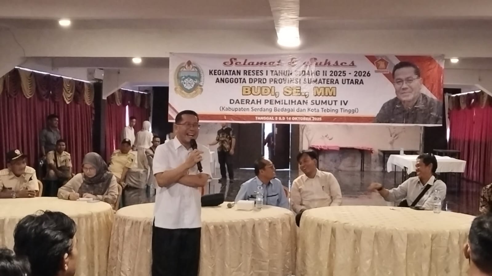 Tebingtinggi, Sumut. OPSINEWS.COM - Anggota DPRD Provinsi Sumatera Utara Fraksi Gerindra, Budi SE menggelar reses 1 tahun Sidang ll 2025 - 2026 yang dihadiri ratusan masyarakat di Aula Hotel Amanda, di jalan Dr Sutomo, Kota Tebingtinggi, Kamis (9/10/2025) sekitar pukul 16.00 WIB.